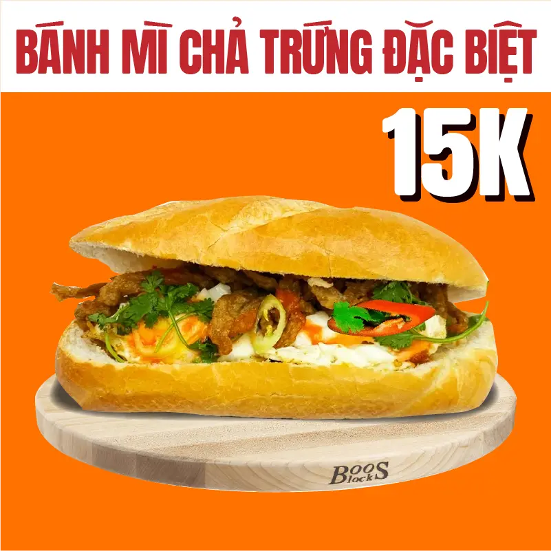 Bánh mì chả trứng đặc biệt gồm: Bánh mì giòn, nhiều chả cá tươi xay nhuyễn ép sợi chiên nóng giòn. Đồ chua, dưa leo, rau răm, ngò, nước mắm tứ vị, pate, sốt dầu trứng, trứng ốp la